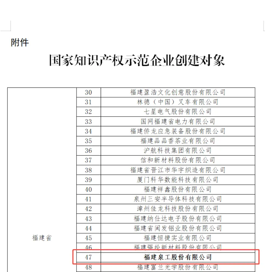 சமீபத்தில், தேசிய அறிவுசார் சொத்து நிர்வாகம் (CNIPA) "தேசிய அறிவுசார் சொத்து வலுவான நாடு கட்டுமான செயல்விளக்க உருவாக்கப் பொருள்களின் மதிப்பீட்டு முடிவுகள் பற்றிய அறிவிப்பை" வெளியிட்டது.புஜியன் குவாங்காங் மெஷினரி கோ., லிமிடெட்.அறிவுசார் சொத்து உருவாக்கம், பயன்பாடு, பாதுகாப்பு மற்றும் மேலாண்மை ஆகியவற்றில் அதன் விரிவான வலிமையின் அடிப்படையில் "2025-2027க்கான தேசிய அறிவுசார் சொத்து விளக்க நிறுவன உருவாக்கப் பொருளாக" வெற்றிகரமாகத் தேர்ந்தெடுக்கப்பட்டது. இந்த வெற்றிகரமான தேர்வு, Quangong Machinery Co., Ltd. இன் உயர்தர அறிவுசார் சொத்து மேம்பாடு மற்றும் வலுவான அறிவுசார் சொத்துரிமை தேசத்தை உருவாக்குவதற்கான தேசிய மூலோபாயத்தை மேம்படுத்துவதற்கான முயற்சிகளின் அதிகாரப்பூர்வ தேசிய அளவிலான அங்கீகாரத்தைக் குறிக்கிறது.