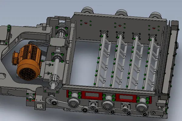 6மின்சாரத்தால் இயக்கப்படும் ஸ்விங் ஆர்ச்-பிரேக்கிங் பேஸ் ஃபீடர் (விரும்பினால்) மின்சாரம் மூலம் இயக்கப்படுகிறது; வளைவு-உடைக்கும் ரேக் பொருளைத் தளர்த்த தண்டைச் சுற்றி ஒரு செட் கோணத்தில் ஊசலாடுகிறது.